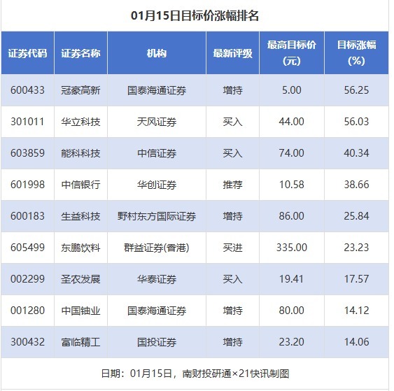 南财投研通数据显示,1月15日钱龙配资,券商给予上市公司目标价共9次,按最新收盘价计算,目标价涨幅排名居前的公司有冠豪高新、华立科技、能科科技,目标价涨幅分别为56.25%、56.03%、40.34%,分别属于造纸、文娱用品、IT服务行业。