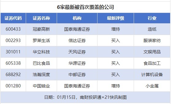 首次覆盖方面,1月15日券商共给出了6次首次覆盖,其中冠豪高新获得国泰海通证券给予“增持”评级,罗莱生活获得信达证券给予“买入”评级,华立科技获得天风证券给予“买入”评级,巴比食品获得华源证券给予“买入”评级,浩瀚深度获得中邮证券给予“买入”评级。