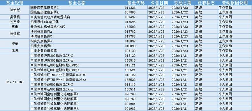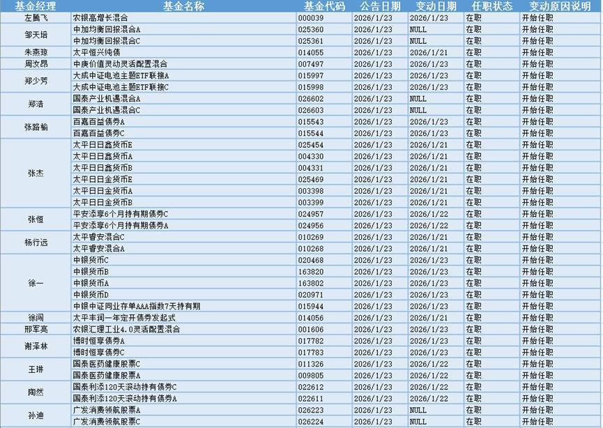基金经理是一只基金产品最核心的成员,能决定一只基金的投资方向、投资策略以及投资风格,基金经理出色的择时选股能力和调研预测能力是基金业绩的有力保证,所以基金经理是投资者在选择基金产品时的重要依据。基金经理的变动很大程度上会影响到基金产品未来的表现,是一个需要特别关注的信息。1月23日共有36位基金经理发生任职变动。