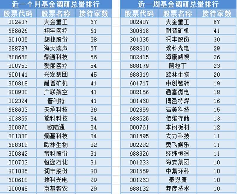 将时间周期缩短到最近一周(1月16日-1月23日)来看,基金调研数量第一的公司是大金重工,大金重工属于金属制品行业,主营业务为生产销售海上风电单桩基础、过渡段、导管架、浮式基础以及塔筒产品,为客户提供海上风电装备的“建造+运输+交付”一站式综合解决方案,可满足全球不同地区海上风电项目的多样化需求。大金重工共被67家基金机构调研,其次被调研数量较多的股票是耐普矿机、润丰股份和埃科光电,分别接受41家、30家和29家基金机构的调研。